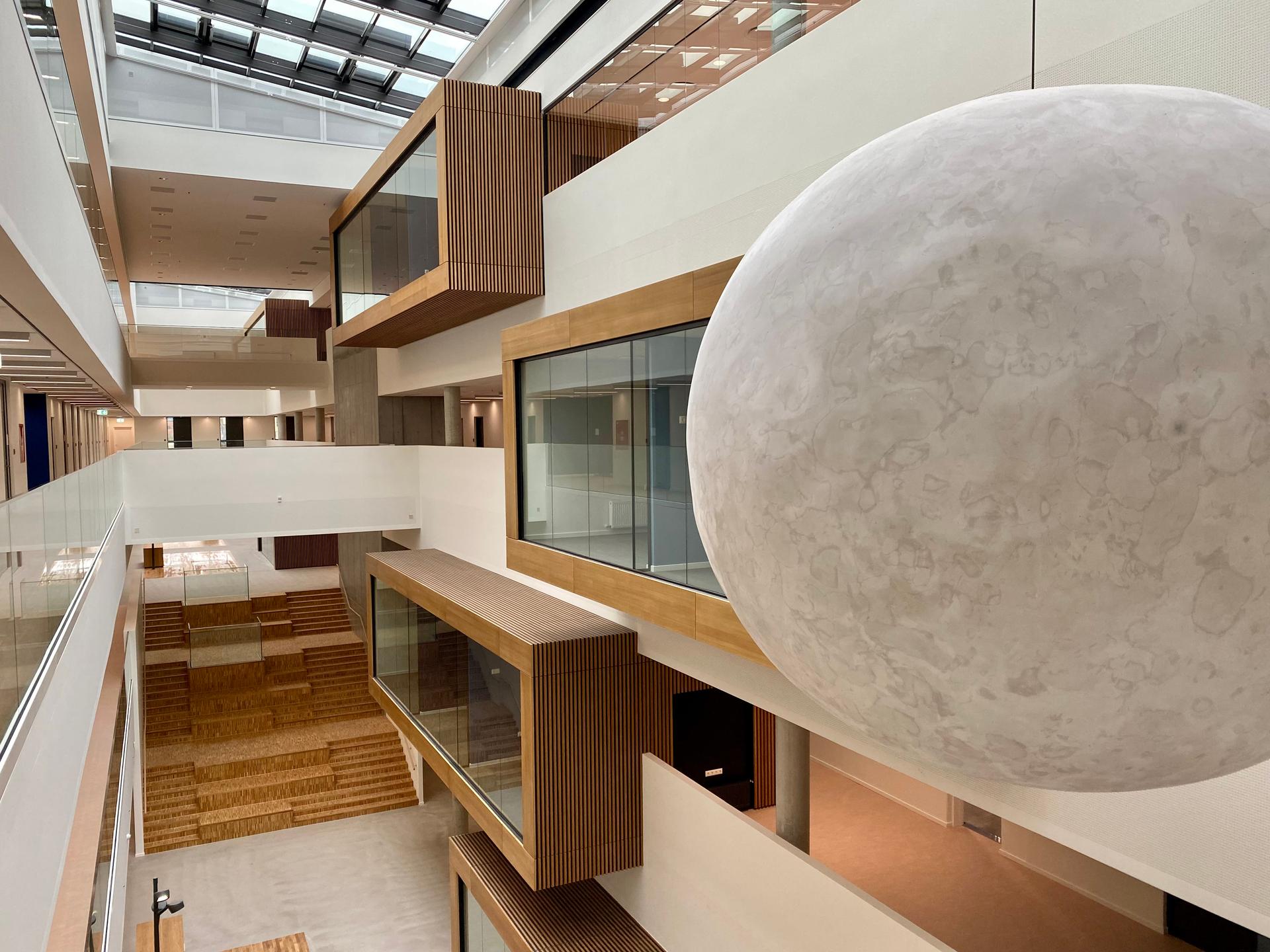 Studiemiljøet på AAU SUND er åbent og indbydende, hvilket giver studerende mulighed for at mødes og arbejde sammen, mens hele bygningen tages i brug.
